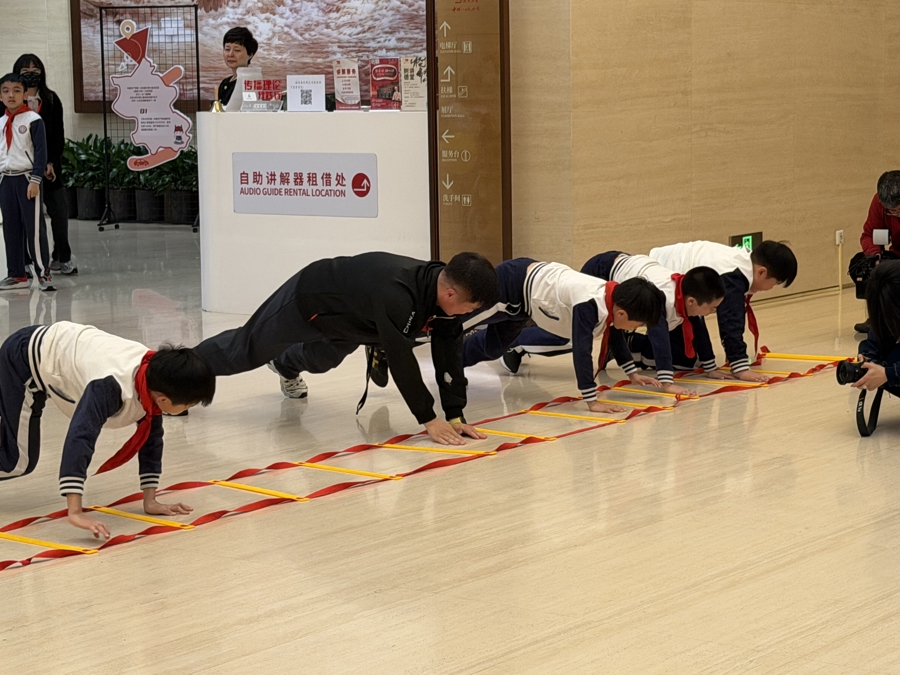 考虑到场馆环境特点,课程在运动量和体能设计上格外用心。“原本预计在广场上的运动量会超过一公里,现在调整为馆内700至800米的定向行走,再配套10分钟的体能练习。”孙申彪说,体能练习以核心、协调、灵敏素质为主,避免大量奔跑,设计了四个趣味项目:搬运3至5公斤的健身球、平板支撑侧移动、“统一战线”手眼协调练习,以及绳梯标志盘接力。“比如‘统一战线’练习,孩子们踩着绳梯,看到哪侧有标志牌就举哪只手,既锻炼了反应能力,也暗含了红色寓意。”